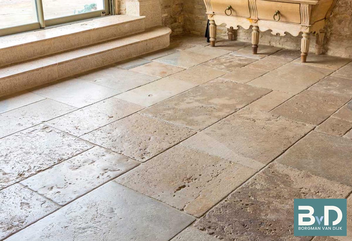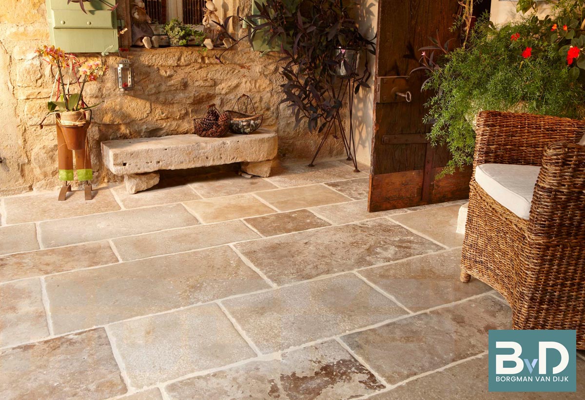 Bourgondische Dallen Chateau Beige Antique 60x90x2,2 cm De Bourgondische Dallen Chateau Beige Brun Antique zijn harde kalstenen tegels uit India. De prachtige kleurnuances bestaan uit beige, gele, geelgroene, okergele, zandgele en bruingele tinten. De breukruwe tegels worden geschuurd/geborsteld en de randen handgekapt. Vervolgens worden deze bewerk...