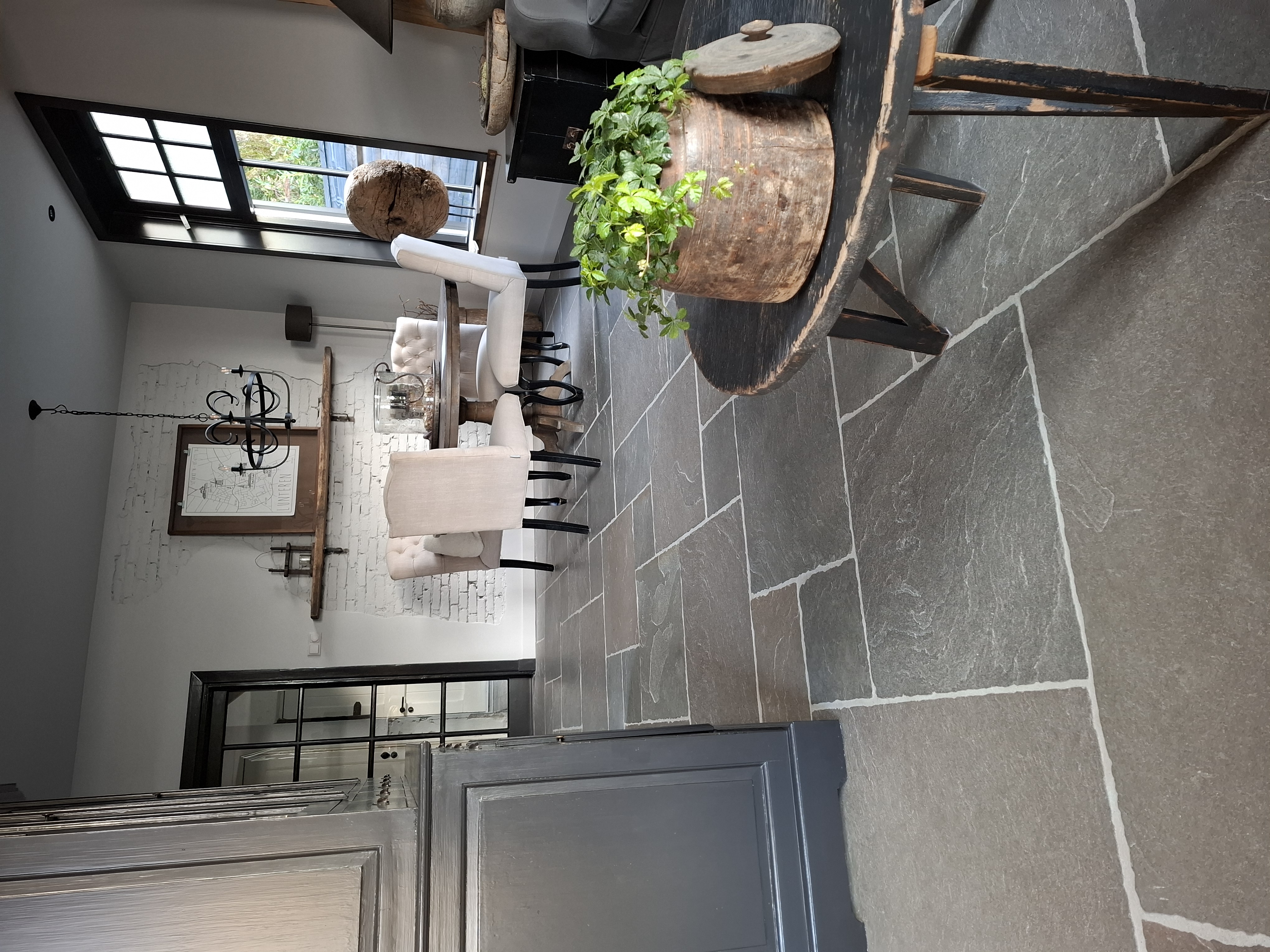 De Bourgondische Dallen vloer Chaumont Noir Antique is een sfeervolle kalkhoudende leisteen die door zijn neutrale kleur makkelijk te combineren is met nagenoeg alle houtsoorten, wit en grijstinten. Deze toch levendige vloer bevat nagenoeg geen aders en fossielen etc.