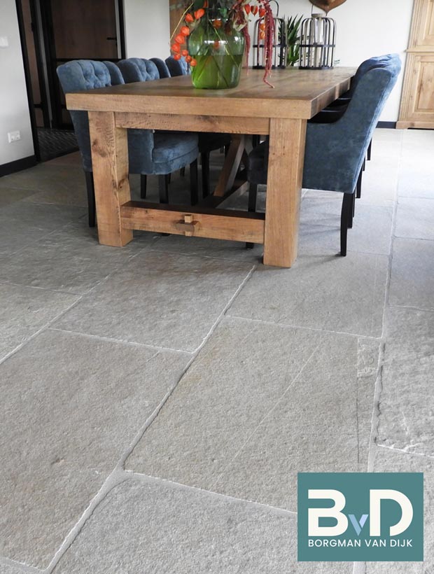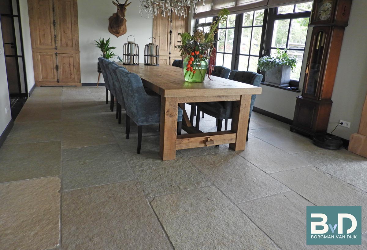 Bourgondische Dallen Chateau Beige Antique 60x90x2,2 cm De Bourgondische Dallen Chateau Beige Brun Antique zijn harde kalstenen tegels uit India. De prachtige kleurnuances bestaan uit beige, gele, geelgroene, okergele, zandgele en bruingele tinten. De breukruwe tegels worden geschuurd/geborsteld en de randen handgekapt. Vervolgens worden deze bewerk...
