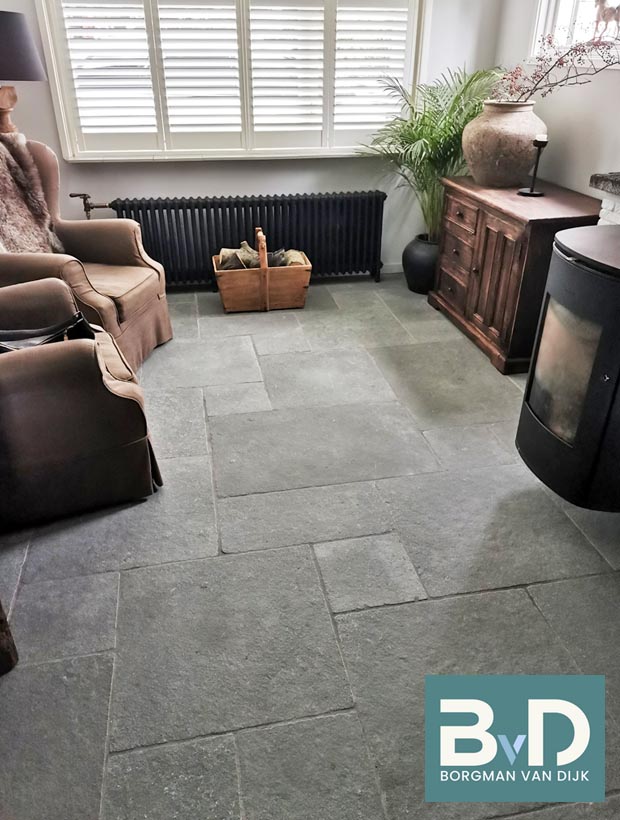 De Castle Stone Blue (Tandur Blue) is een harde kalsteen uit India. De prachtige kleurnuances bestaan uit diverse grijs en grijsblauwe tinten. De breukruwe tegels worden diverse keren geborsteld en de randen handgekapt. Vervolgens worden deze bewerkte tegels gevibreerd in een bad met keramiekkorrels. Hierdoor onstaat er een geleefde / verouderde tegel met een breukruw slijtvast oppervlak. De Castle Stone Blue is geschikt voor binnen en buiten en wordt vaak toegepast bij een landelijke inrichting, als kasteelvloer / kloostervloer bij oude huizen en monumentale panden en uiteraard in de tuin als pad en terras.