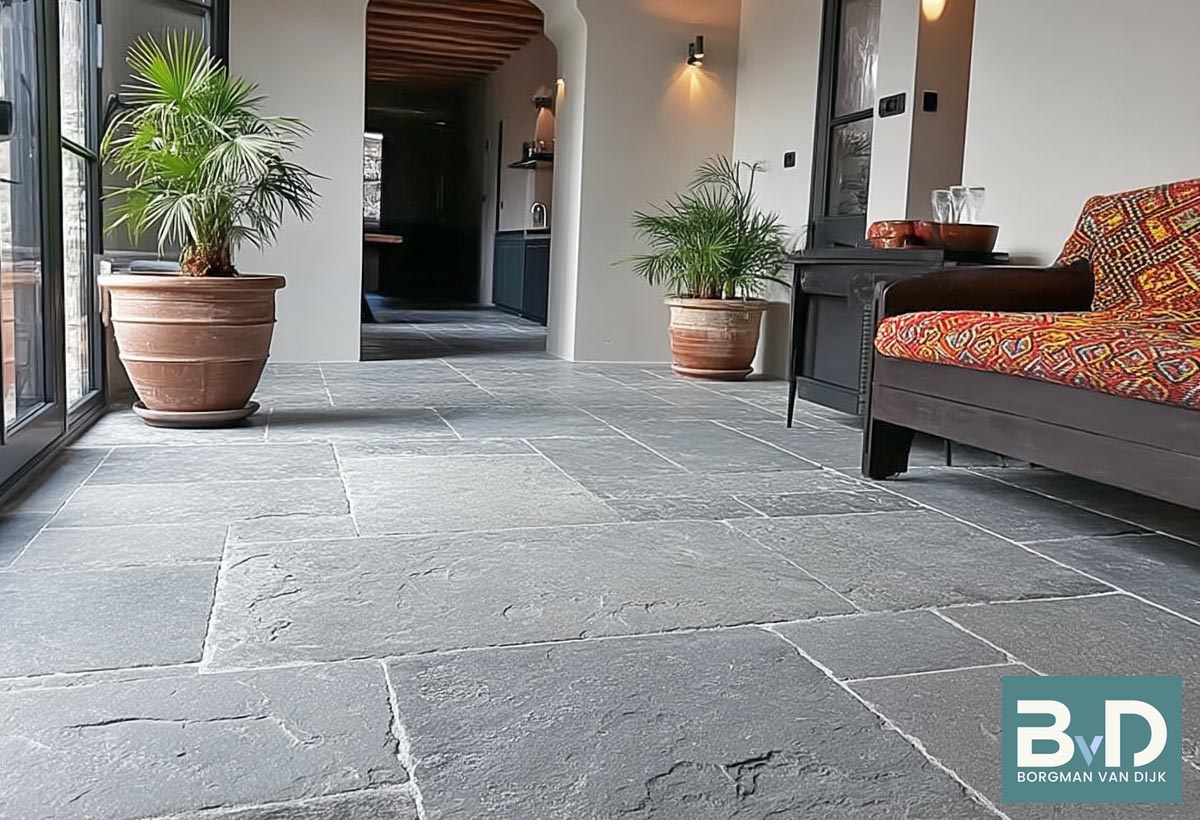 De Castle Stone Blue (Tandur Grey) is een harde kalsteen uit India. De prachtige kleurnuances bestaan uit diverse grijs en grijsblauwe tinten. De breukruwe tegels worden geschuurd/geborsteld en de randen handgekapt. Vervolgens worden deze bewerkte tegels gevibreerd in een bad met keramiekkorrels. Hierdoor onstaat er een geleefde / verouderde tegel met een breukruw slijtvast oppervlak. De Castle Stone Blue is geschikt voor binnen en buiten en wordt vaak toegepast bij een landelijke inrichting, als kasteelvloer / kloostervloer bij oude huizen en monumentale panden en uiteraard in de tuin als pad en terras.
