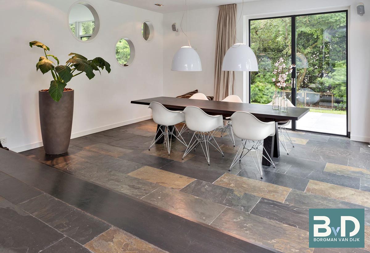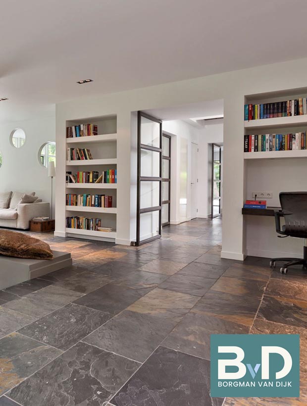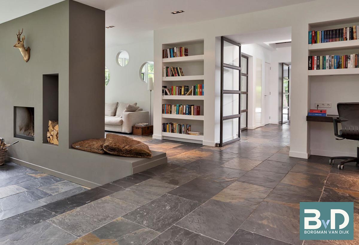 De Indiaas Leisteen Breukruw (Castle Stone Black) is een sfeervolle kalkhoudende leisteen die door zijn neutrale kleur makkelijk te combineren is met nagenoeg alle houtsoorten, wit en grijstinten. Deze toch levendige vloer bevat nagenoeg geen aders en fossielen etc.