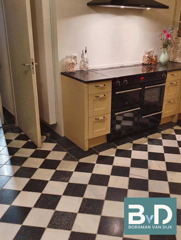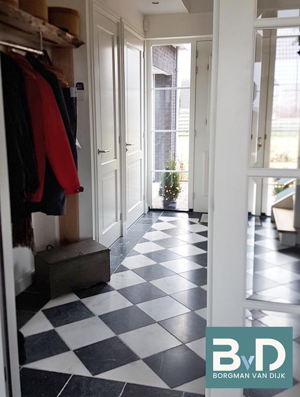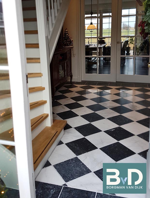 Zwart Wit marmer 40x40x1,2 cm Getrommeld € 54,95 p/m2 Topkwaliteit marmer uit Turkije. Zeer goede maatvoering en gelijk van dikte. Wordt veelal toegepast als vloer en wandtegel. Eenvoudig op maat te zagen en verwerken met een professionele witte tegellijm. Kan zowel kleurloos als kleurverdiepend worden geimpregneerd. Niet zuurbestendig en daardoor neut...