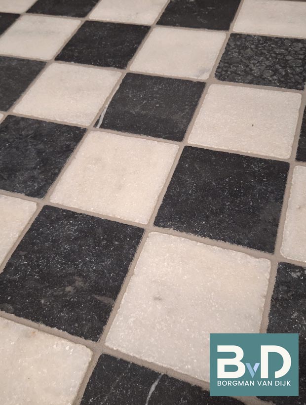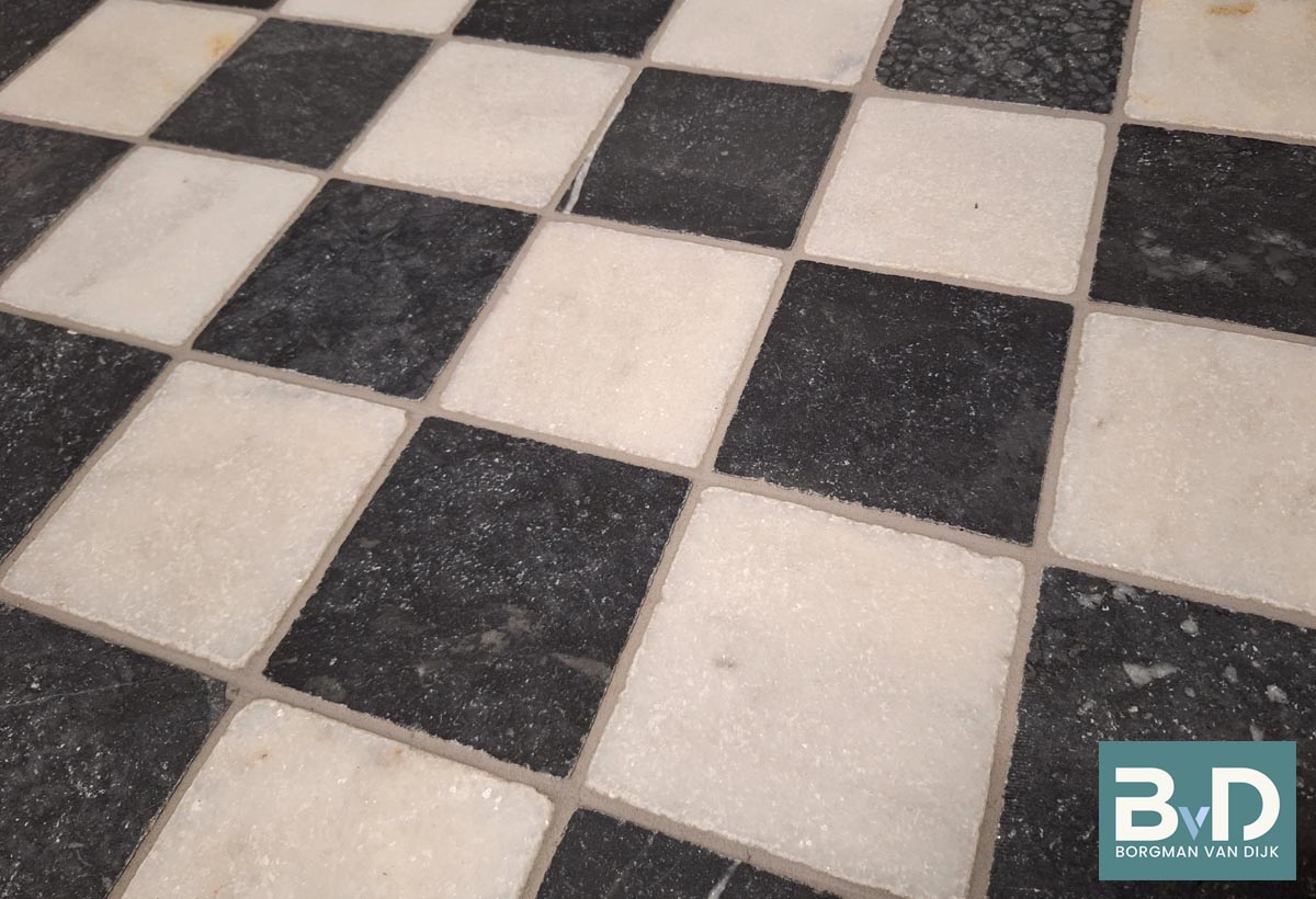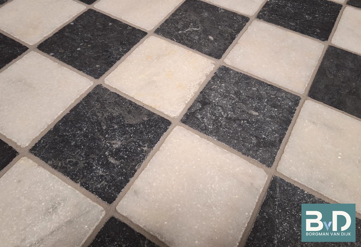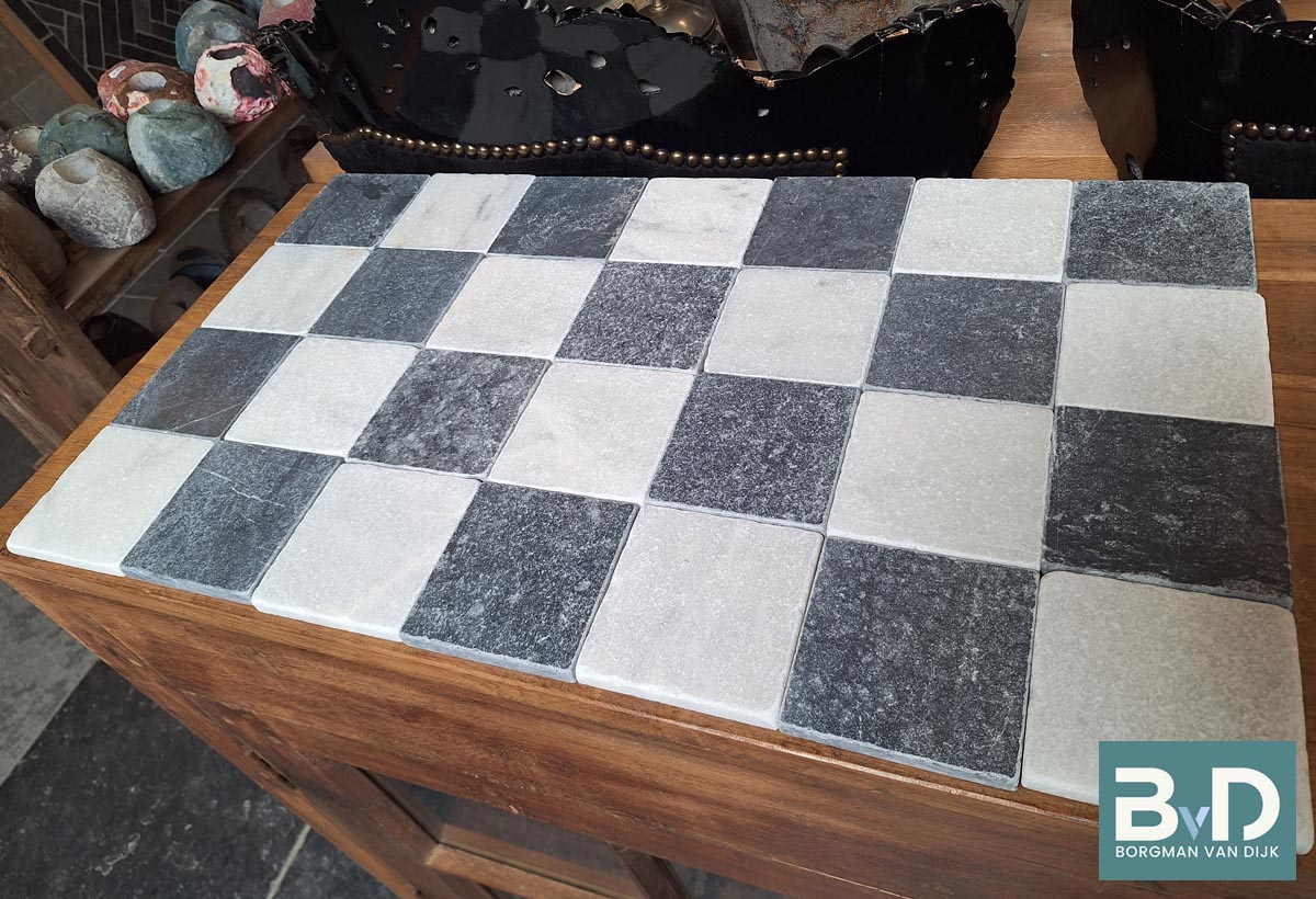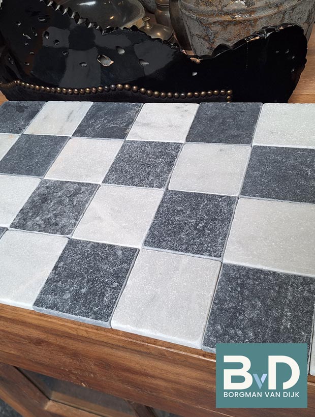Zwart Wit marmer 10x10x1,2 cm Getrommeld € 46,95 p/m2