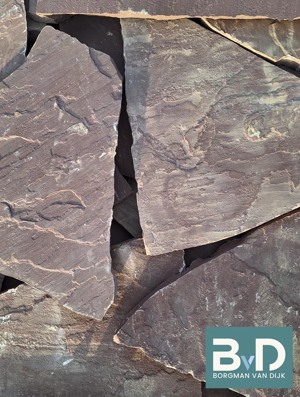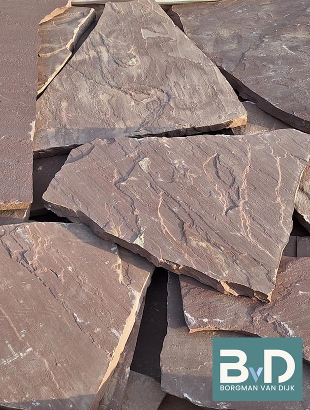 Mandana Red flagstones zijn zeer mooie flagstones afkomstig uit India. Vrij egaal purperrood van kleur en zeer gelijkend op de flagstones Rode Weser uit Duitsland. De Mandana Red flagstones worden veelvuldig toegepast als terras, pad, stapelmuur en vijverafwerking.