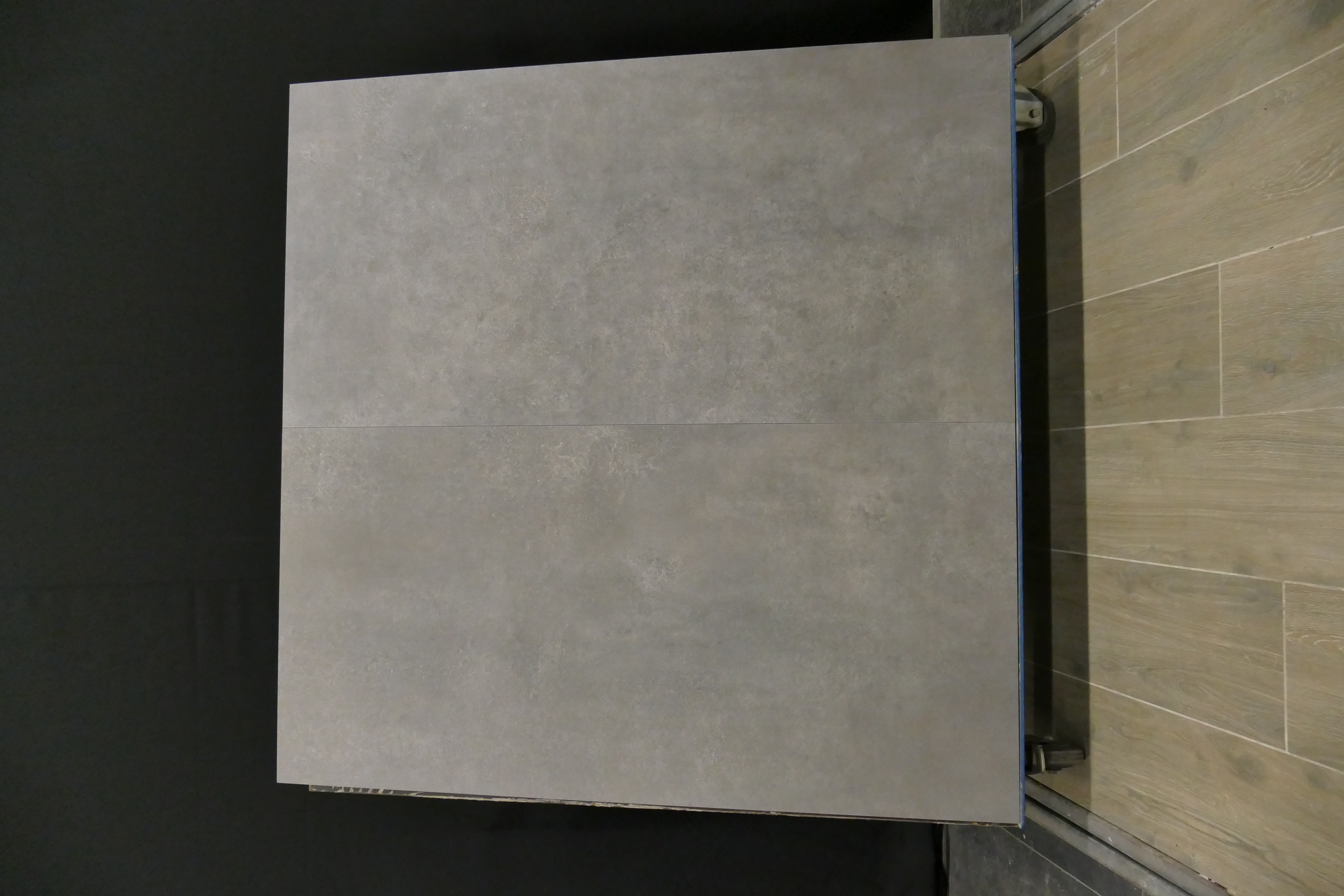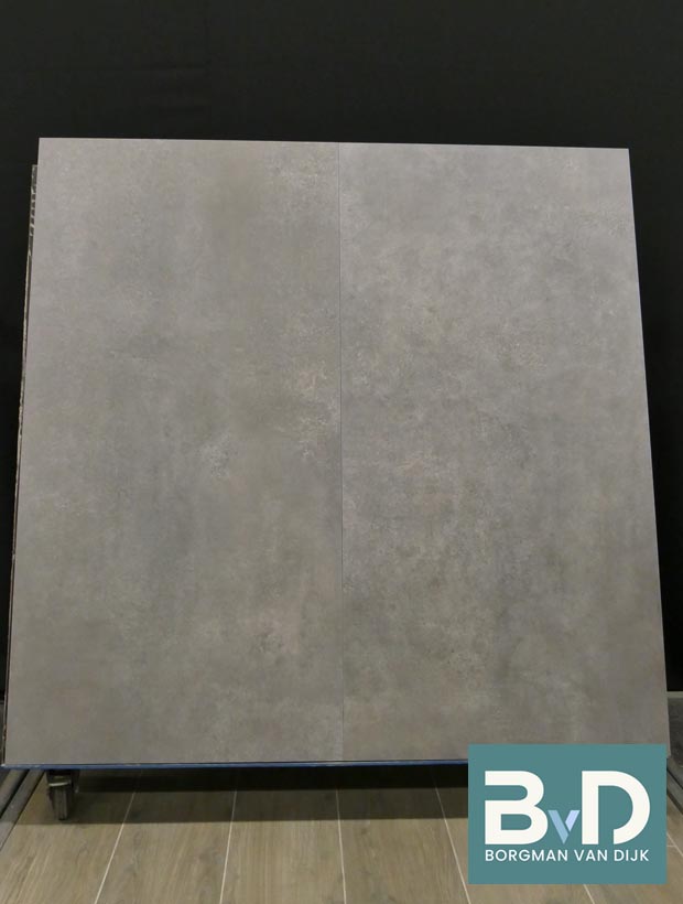Betonlook keramische vloer/wandtegels. Zeer sprekend!